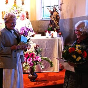 Die Vorabendmesse wurde von der Frauenrunde musikalisch gestaltet. Im Anschluss wurde unsere "Hanni" für ihre 35-jährige Obfrau-Tätigkeit geehrt. Im Namen der Pfarre überreichte ihr Amstler Kurt eine Marienstatue, die Msgr. Hofer gleich weihte.